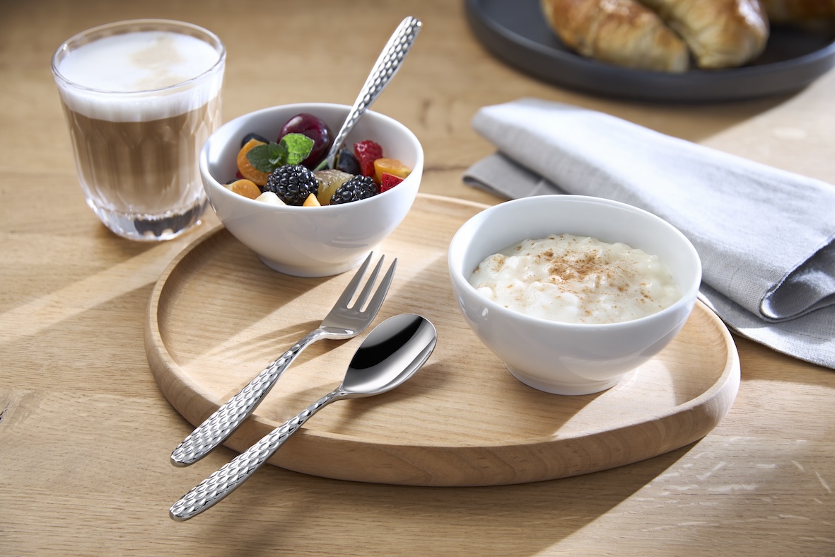 With “THE NEW EASY” concept, WMF Professional fulfils the desire for variety and modern design with six different cutlery collections. The ensemble has been given an exciting new addition: “TESSA” is now entering the world of personalised table design. The new model is characterised by powerful shapes, elegant curves and a striking haptic. The drop-shaped spoons and the prongs of the fork with their narrow, elongated look are particularly eye-catching. The special highlight of TESSA, however, is the unusual design of the surface of the handle. The elegant structure is not only impressive, but also significantly enhances the unmistakable feel. “THE NEW EASY aims to offer young, uncomplicated and on-trend designs that appeal to restaurateurs from a wide range of sectors”, says Stephan Schmuck, Lead Product Management at proHeq GmbH, describing the concept. “The TESSA collection captures the spirit of the times with its innovative design, making it the perfect addition.”