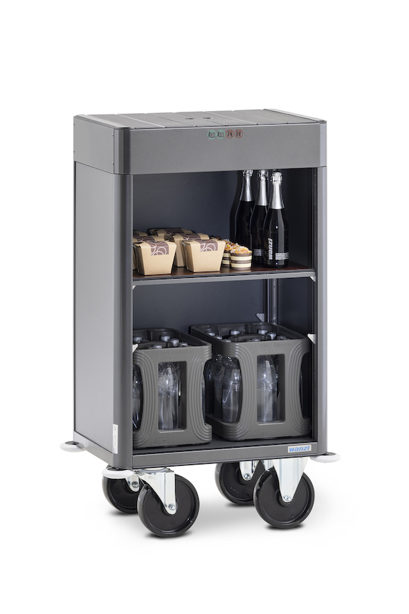 Der neue leichte Aluminiumaufbau, der für das Housekeeping wichtige Produkte vorhält, oder doch lieber eine elegante Deckplatte in Holzoptik für den Einsatz im Service? Die Ausstattungspalette des neuen Mundus erlaubt maximale Gestaltungsfreiheit. Mit vier Trolley-Größen, den Dekoren „Mahagony“, „Natural Oak“ und „Anthracite“ sowie den Rahmenfarben „Titanum Grey“, „Metallic Black“ und „Metallic Gold“ passt sich der Mundus jedem Hotelinterieur oder Corporate Design an. Die optimierte Montage der Anbauteile sorgt dafür, dass sich diese nun noch leichter austauschen und montieren lassen – bei bleibender Kompatibilität zu bisherigen Mundus-Modellen. Die neu konzipierten Regalhalterungen erleichtern dabei den Wechsel deutlich, gleichzeitig bieten sie den gewohnt sicheren Halt. Bei der Farbe des textilen Zubehörs setzt Wanzl auf stilvolles Anthrazit oder dezentes Beige. Neben den Neuerungen bleiben bewährte Komponenten weiterhin im Einsatz: Wanzls berühmtes fünftes Rad am Wagen spielt bei der Beweglichkeit des Mundus nach wie vor die Hauptrolle: Denn nur dadurch lässt sich der Trolley problemlos um die eigene Achse drehen und ermöglicht so gerade im Housekeeping maximale Wendigkeit bei der täglichen Arbeit in manchmal engen Räumlichkeiten.